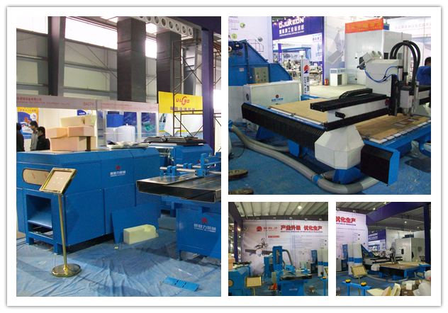 本次展会我公司展示出新开发的ESF101-2全数控编程裁板机、重新改良提高工作效率的ESF001D软垫填充机、增加一把刀实现海绵块切成规则颗粒的ESF007-3海绵切粒机。